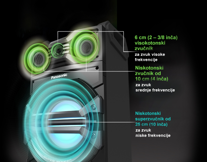 Moćni zvuk zahvaljujući super niskotoncu od 25 cm i trostrukim pojačalima. Dizajniran sa ručkom koja se može izvući i točkićima za jednostavno korišćenje van kuće. Kompatibilan sa Bluetooth-om i USB-om, ovaj model kreira moćan zvuk iz različitih muzičkih izvora.