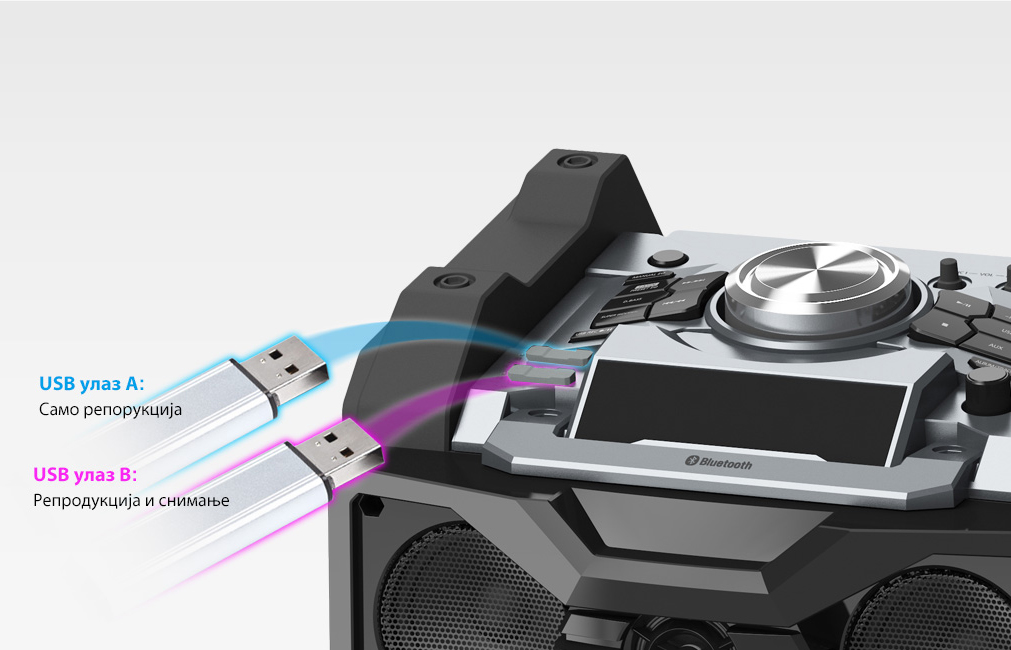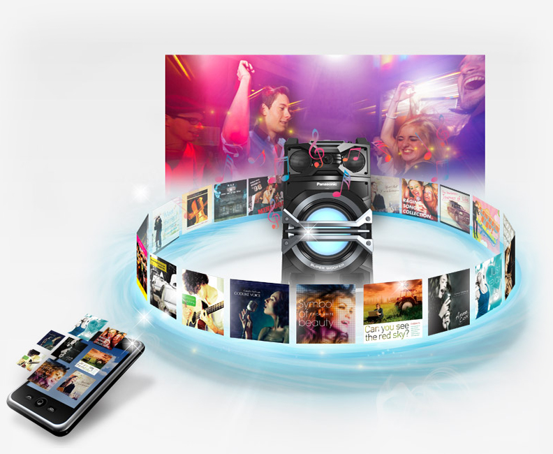 DJ Jukebox reprodukuje pesme sa USB uređaja pomoću režima Mix Play. Takođe, možete upravljati popisima pesama i reprodukovati pesme na zahtev putem aplikacije Panasonic MAX JUKE App.
